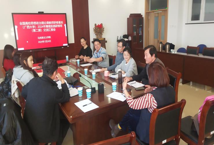 2024年1月24日,马克思主义学院在知行楼A624召开全国高校思想政治理论课教师基地(广西大学)2024年寒假实践研修班(第二期)交流汇报会,院长金鑫以及研修班全体学员参会,会议由研修班联络人张艳主持。