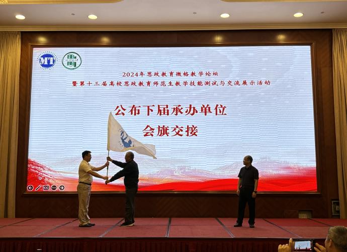 马克思主义学院院长金鑫进行了2025年思政教育微格教学论坛暨第十四届高校思政教育师范生教学技能测试与交流展示活动承办权的申请汇报和竞选,详细介绍了我校历史发展、办学特色、人才培养和办赛条件等方面情况。经全体参会教师现场投票和中国教育技术协会微格教学专业委员会审议,我校在四家申请单位中胜出,成功获得承办权。中国教育技术协会微格教学专业委员会理事长孟宪凯向我校授旗。