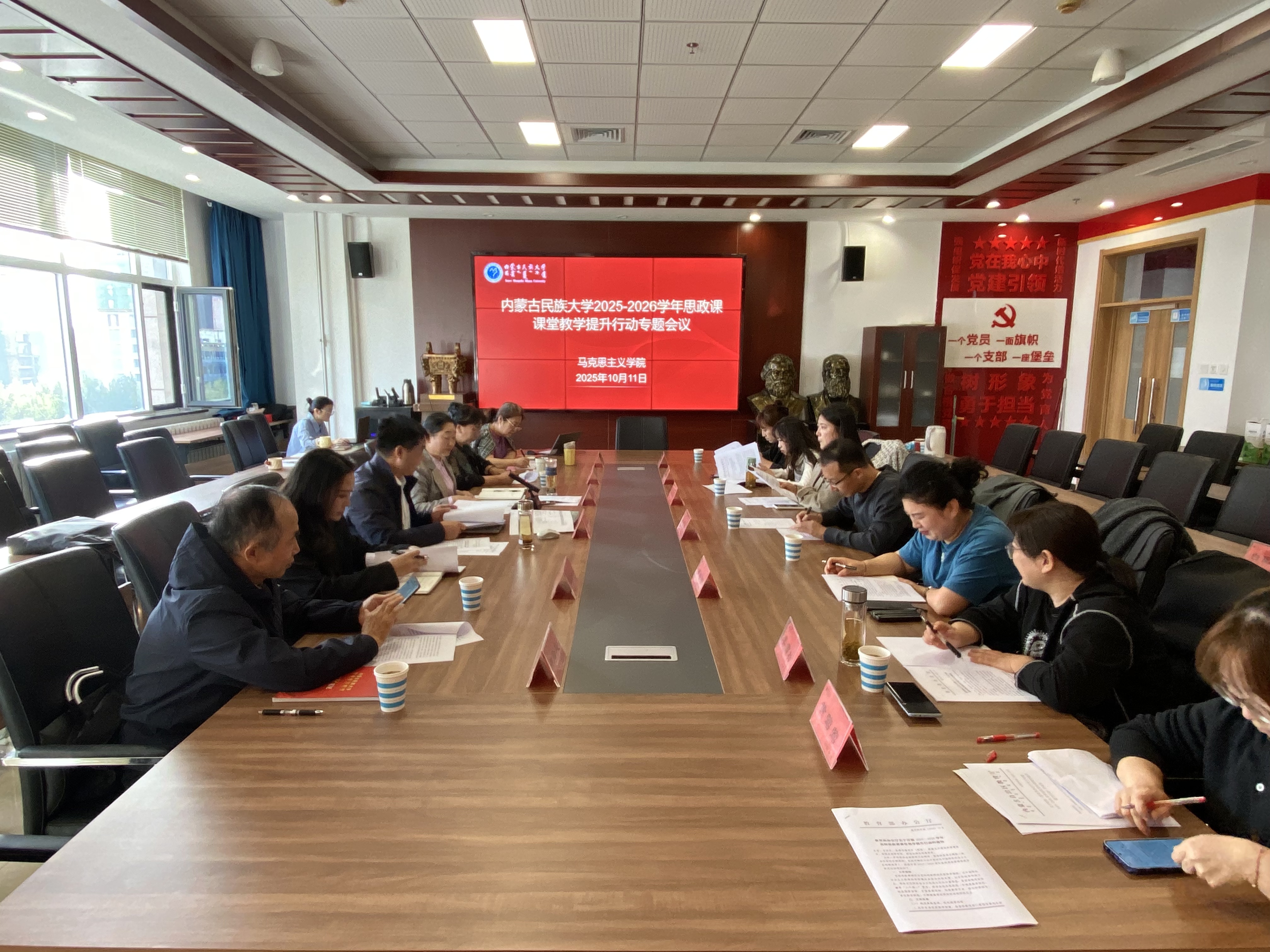 为深入贯彻落实教育部办公厅《关于开展2025-2026学年高校思政课课堂教学提升行动》的通知要求,马克思主义学院于10月11日举办高校思政课课堂教学提升行动专题会议。学院党委书记田宗会、副院长舒心心、副书记山丹、学校督导卢少志教授、刘雅琴教授、学院督导张丽红教授、思想政治理论课教研室主任出席会议。会议由舒心心主持。