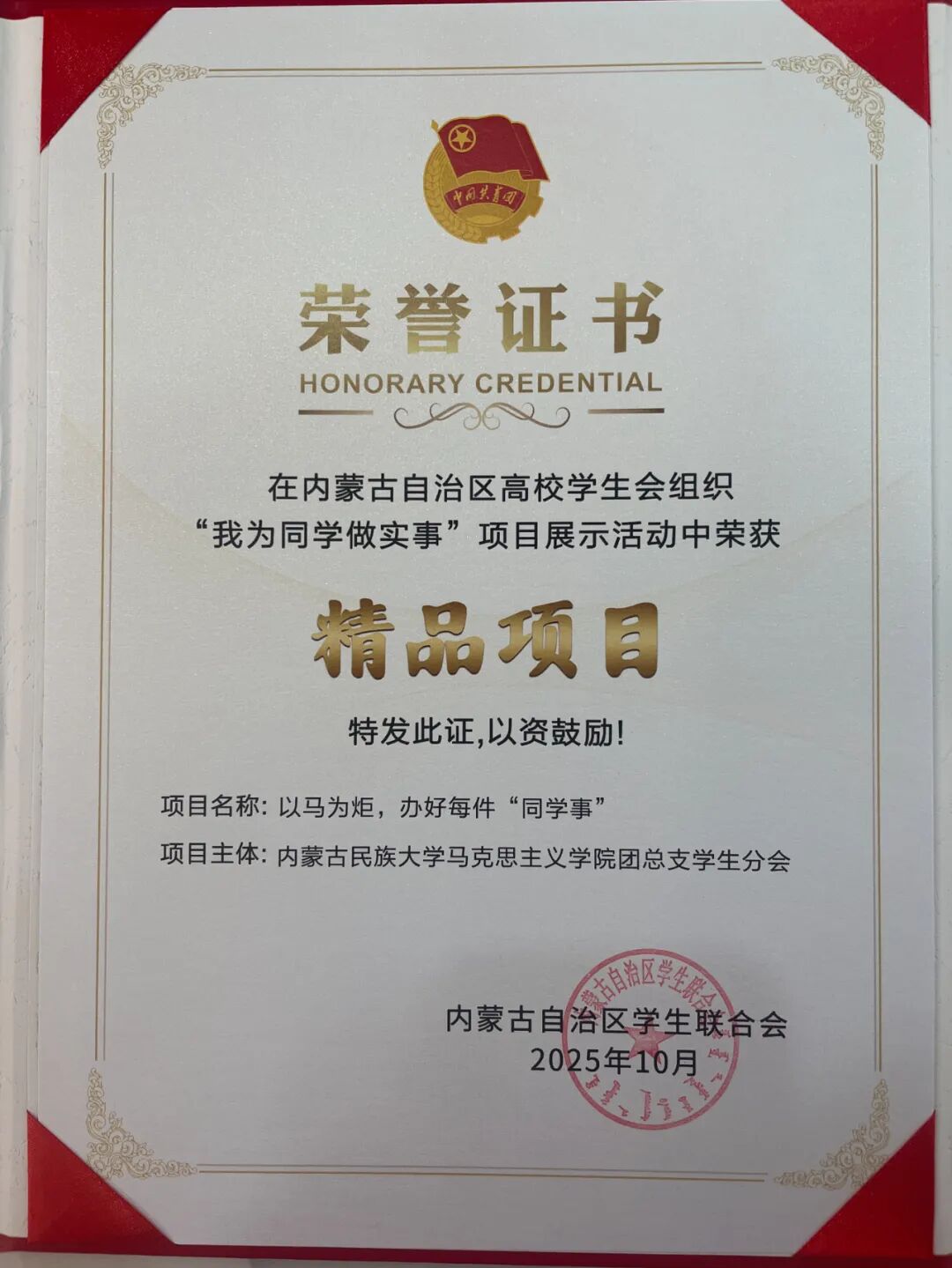 10月19日至20日,内蒙古自治区高校学生会组织“我为同学做实事”项目展示交流活动在内蒙古建筑职业技术大学举行。全区高校校院两级学生会共申报186个“我为同学做实事”服务项目,经专家评审,最终50个项目入围交流展示活动。马克思主义学院团总支学生分会申报的“以马为炬,办好每件‘同学事’”项目成功入选交流展示环节,与区内各高校其他项目同场交流并获评“精品项目”荣誉。学院团总支书记德力根胡、学生分会主席郭昕晔参加展示交流活动。