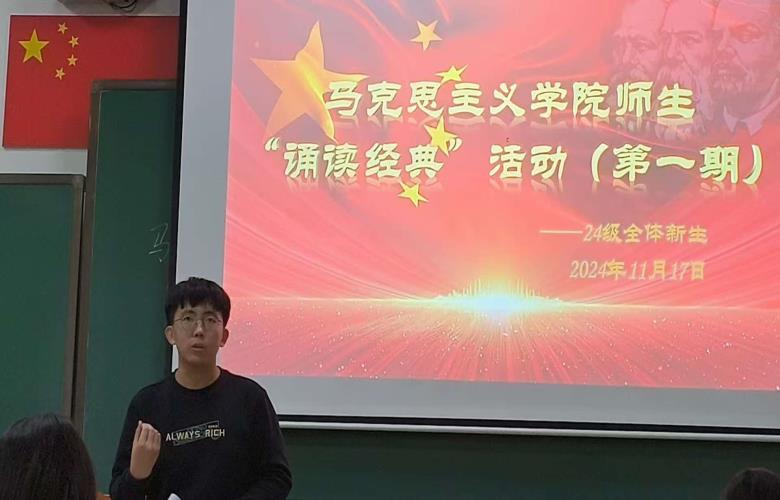 活动前,我院下发了《马克思主义基本原理》“诵读经典”实践教学实施方案以及活动具体安排,并对参与活动的24级学生进行广泛动员,指导学生认真学习马克思主义经典著作和相关文献,确定诵读的主题、内容和形式等,充分调动了学生的积极性。本次活动一共四期,第一期由我院教师昝桂丽和王小巍负责,活动中,同学们通过小组接力读、个人诵读、集体诵读等方式,激情饱满地朗诵了一篇篇马克思主义的经典著作,包括《共产党宣言》、《青年在选择职业时的考虑》、《在马克思墓前的讲话》、《矛盾论》、《实践论》、《在纪念马克思诞辰200周年大会上的讲话》等。
