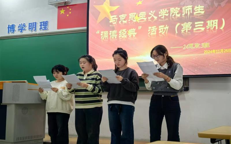 活动前,我院下发了《马克思主义基本原理》“诵读经典”实践教学实施方案以及活动具体安排,并对参与活动的24级学生进行广泛动员,指导学生认真学习马克思主义经典著作和相关文献,确定诵读的主题、内容和形式等,充分调动了学生的积极性。本次活动一共四期,第三期由我院教师梁焕然和王倩负责,活动中,同学们通过个人诵读、集体诵读等方式,激情饱满地朗诵了一篇篇马克思主义的经典著作,包括《共产党宣言》、《矛盾论》、习近平总书记关于《青年要自觉践行社会主义核心价值观》的讲话等。