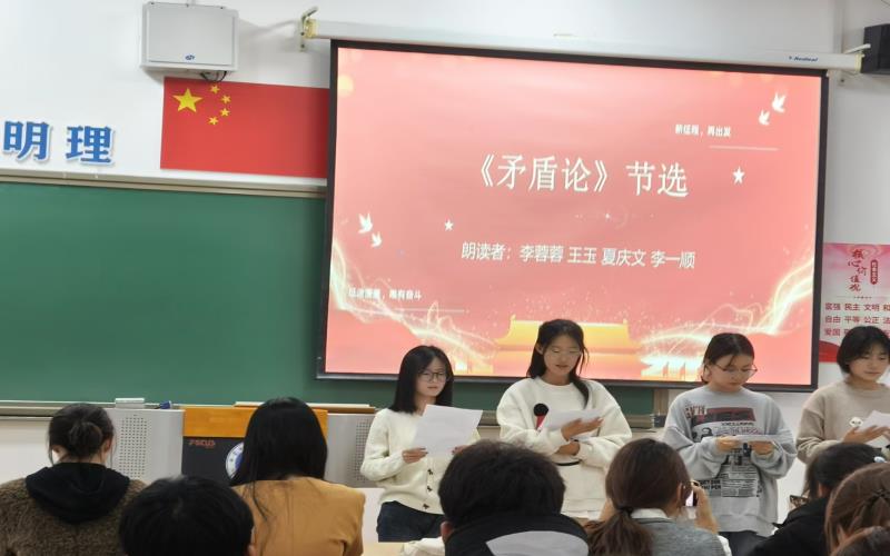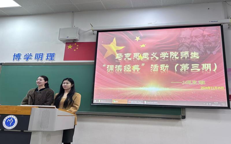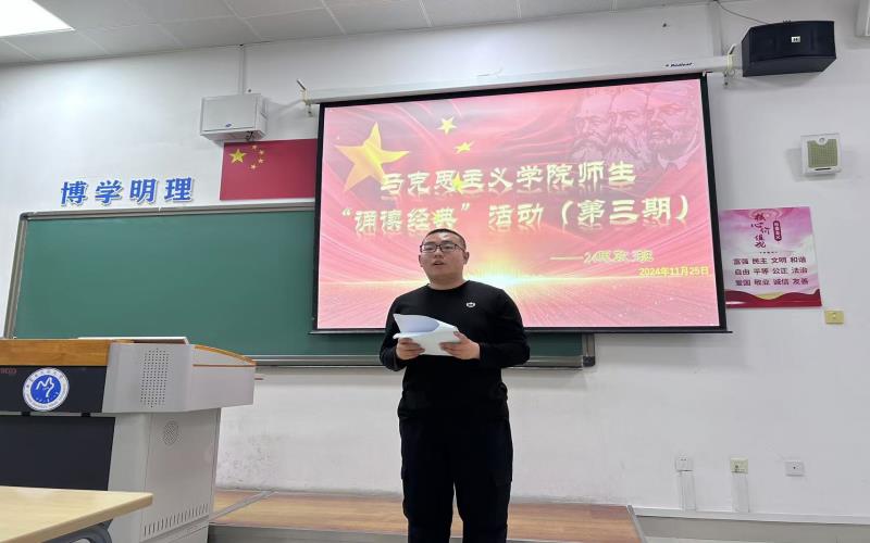 为了进一步发挥我院思想政治理论课实践教学的特色和优势,积极引导学生研读马克思主义经典著作,加深对马克思主义基本原理的理解,提高学生研习马克思主义经典著作的能力,感悟马克思主义的理论魅力,11月25日下午,马克思主义学院在实验楼308举办了第三期马克思主义经典诵读活动。