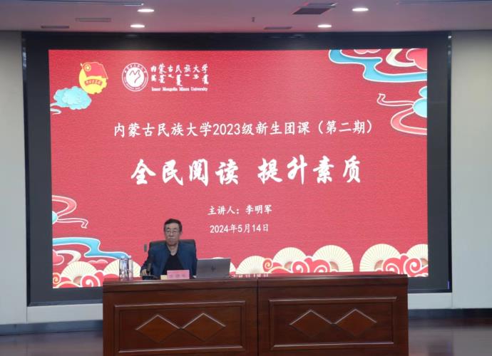 为贯彻落实习近平总书记考察内蒙古重要讲话和指示批示精神以及习近平总书记同团中央新一届领导班子集体谈话精神,加强青年团员思想政治教育。5月14日晚,马克思主义学院联合管理学院于图书馆小报告厅开展“全民阅读,提升素质”主题2023级新生团课。本次团课由内蒙古民族大学文学院教授李明军主讲,马克思主义学院团总支书记德力根胡主持。学院共63名2023级团员参加。