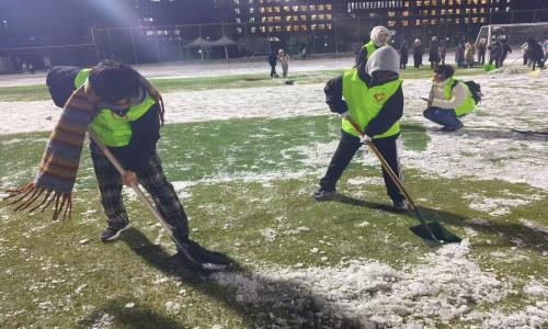 一场大雪飘落校园,银装素裹虽美,却也给师生出行带来不便。为保障校园交通安全与道路畅通,保证师生出行安全。11月26日-27日,马克思主义学院青年志愿者协会于西拉木伦校区知行楼阶梯及南侧、操场开展“银锹破冰雪,志愿暖冬行”扫雪活动,共计55名志愿者参与此次活动。