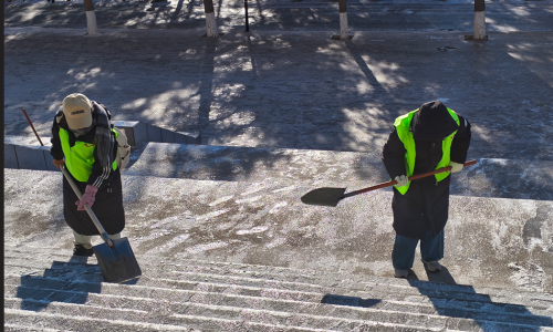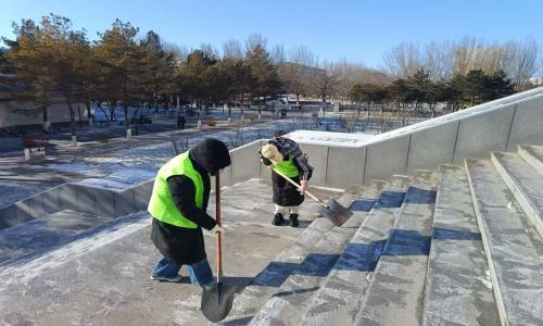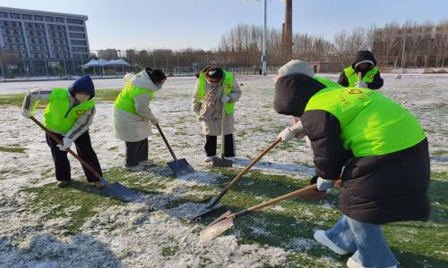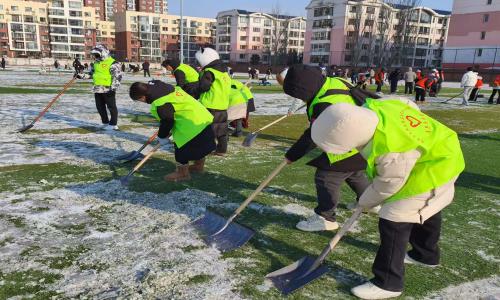 在扫雪现场,同学们手持铁锹不畏严寒,奋力用工具捣碎冰块、清理薄冰以及搬运积雪。铁锹与地面的碰撞声、清扫积雪的沙沙声,交织成一首欢快的劳动交响曲,劳动的身影在雪地里构成了一道亮丽的风景线。