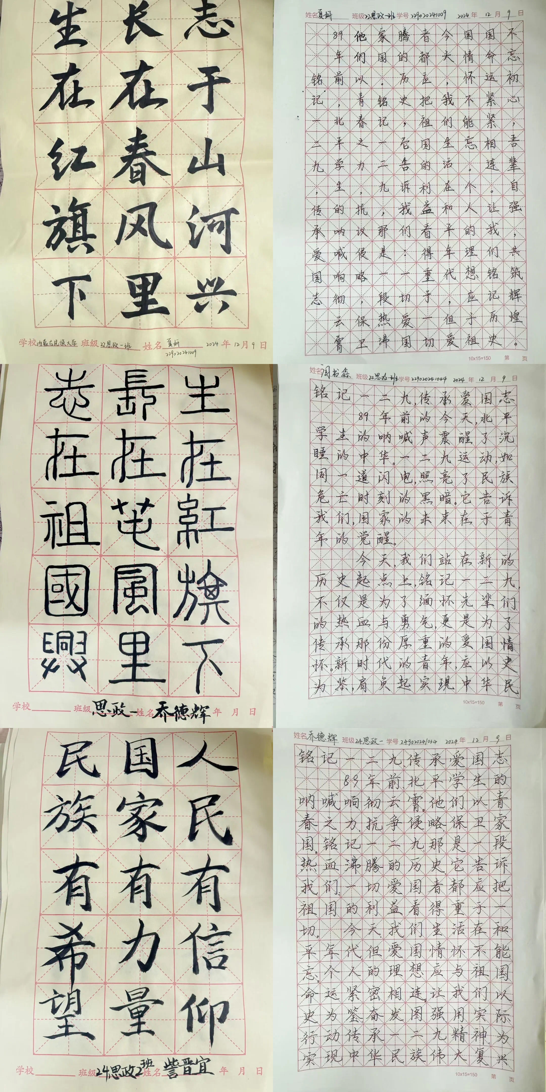 比赛分为硬笔书法与软笔书法两组,参赛作品题材围绕“一二·九”运动的历史意义、爱国情怀以及对当代青年的激励等主题展开。同学们们围绕主题,挥毫泼墨,在横竖撇捺间展现出对“一二·九”运动深刻的理解与感悟。硬笔书法作品刚劲有力,软笔书法作品则气势恢宏,无论是飘逸的行书、规整的楷书还是古朴的隶书,都饱含着对先辈的敬意和对祖国的热爱。