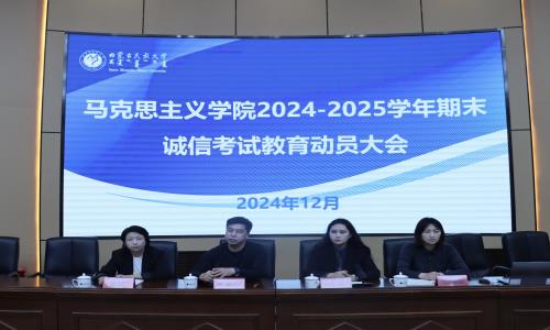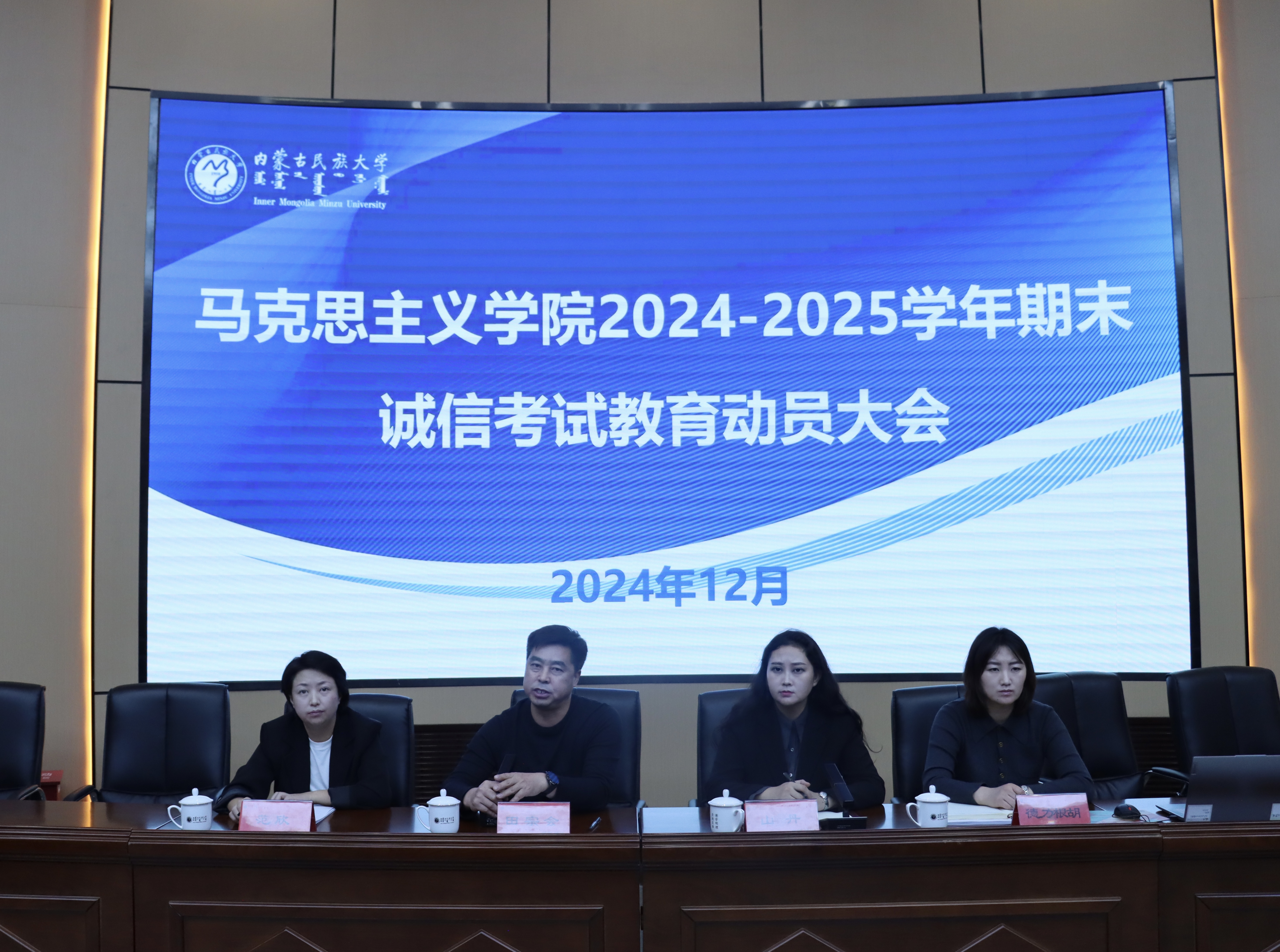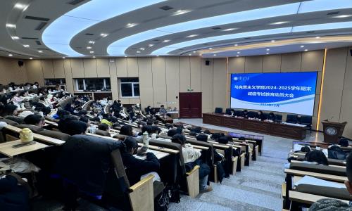 为进一步加强学风建设,严肃考风考纪,增强学生诚信意识和纪律意识,12月10日,马克思主义学院于霍林河校区明理楼报告厅召开2024-2025学年期末诚信考试教育动员大会。马克思主义学院党委书记田宗会、副书记山丹、学工办主任范欣、团总支书记德力根胡、本科生及研究生共190名学生参加本次大会,会议由学工办主任范欣主持。